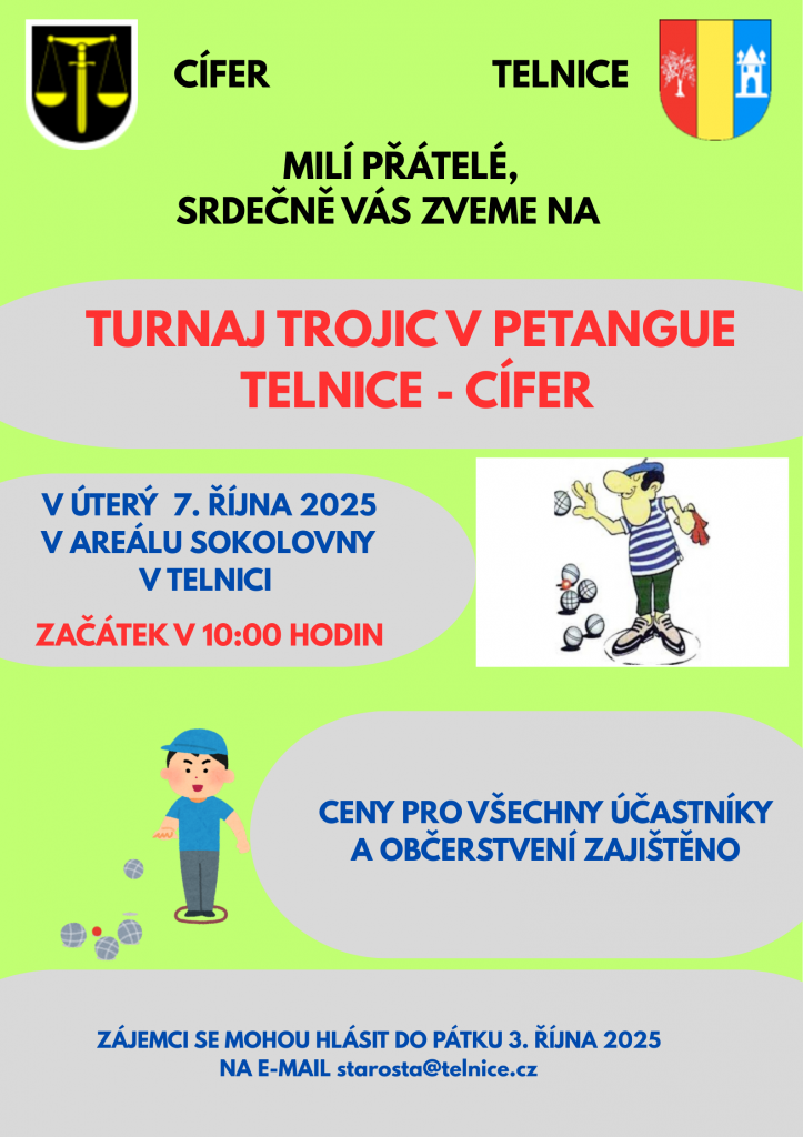 Zveme všechny telnické zájemce o hru petanque na turnaj mezi obcemi Telnice a Cífer v úterý 7. října 2025 od 10:00 hodin. Zájemci se mohou hlásit do pátku 3. října 2025 na obecním úřadě nebo e- mailem starosta@telnice.cz.