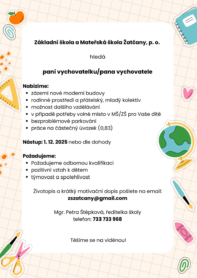 Nabídka práce: vychovatel/vychovatelka (Žatčany)