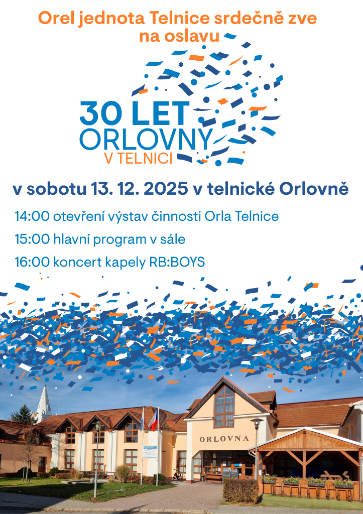 Orel jednota Telnice srdečně zve na oslavu 30 let orlovny v Telnici – v sobotu 13. prosince v telnické orlovně.