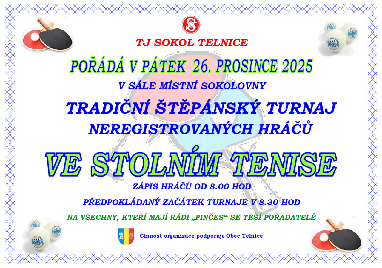 TJ Sokol Telnice pořádá v pátek 26. prosince 2025 v sále místní sokolovny tradiční turnaj neregistrovaných hráčů ve stolním tenise. Zápis hráčů od 8:00 hodin.