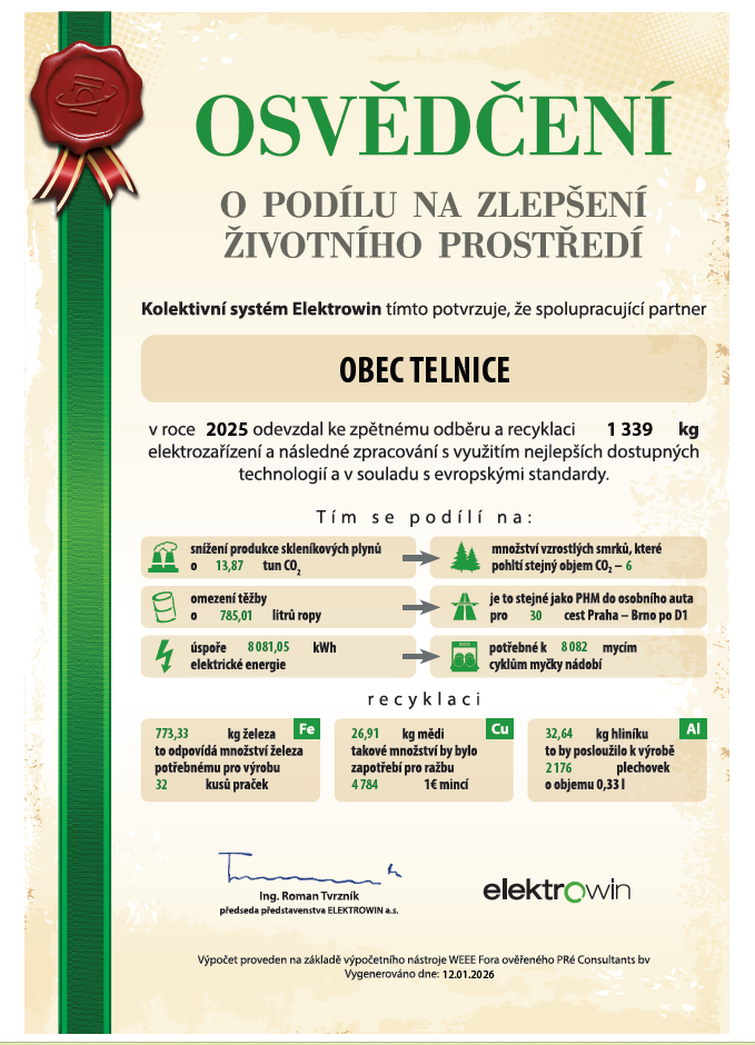 Díky obyvatelům se naše Obec Telnice může za rok 2025 pochlubit výsledky sběru vysloužilého elektrozařízení předaného ke zpětnému odběru společnosti Elektrowin o celkové hmotnosti 1,34 t. Každý obyvatel tak odevzdal průměrně 0,80 kg spotřebičů. Ušetřili jsme tak spotřebu elektřiny a snížili produkci skleníkových plynů. Nespotřebovali jsme ropu, železnou rudu, měď a hliník, které jsou potřebné pro průmyslovou výrobu. Nahradili jsme je právě recyklací odevzdaných spotřebičů.