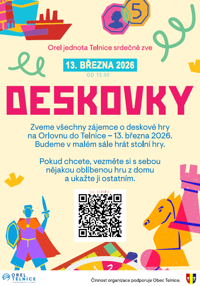 Orel jednota Telnice zve všechny zájemce o deskové hry na Orlovnu do Telnice v pátek 13. března 2026. Od 15:00 hodin v malém sále se budou hrát stolní hry. Můžete si přinést i svoji oblíbenou hru.