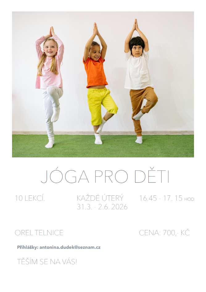 Orel Telnice zve na jógu pro děti – každé úterý od 31. března do 2. června 2026 v době od 16:45 do 17:15 hodin. Přihlášky na: antonina.dudek@seznam.cz.
