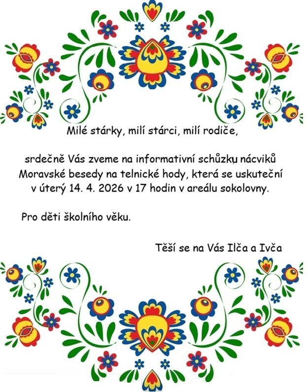 Milé stárky, milí stárci, milí rodiče, srdečně Vás zveme na informativní schůzku nácviků Moravské besedy na telnické hody, která se uskuteční v úterý 14. dubna 2026 v 17 hodin v areálu sokolovny. Pozvánka je určena pro děti školního věku. Těší se na Vás Ilča a Ivča.
