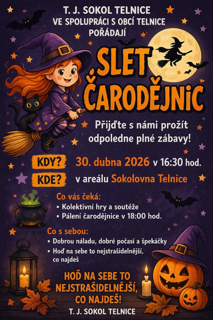 T. J. Sokol Telnice ve spolupráci s obcí Telnice pořádají Slet čarodějnic - ve čtvrtek 30. dubna v 16:30 v areálu Sokolovny Telnice.